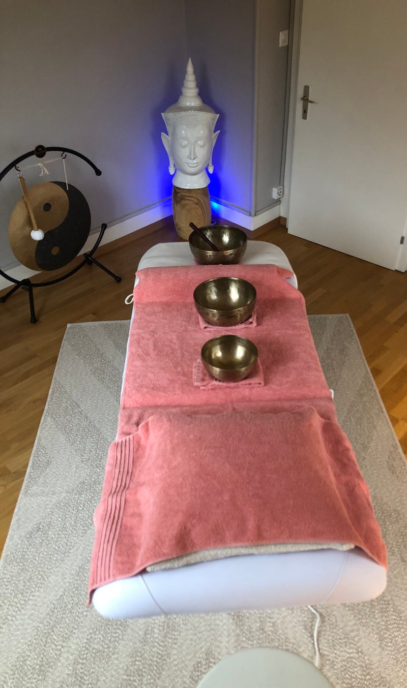 J'utilise des bols chantants, gong comme thérapie lors de la séance de soin.